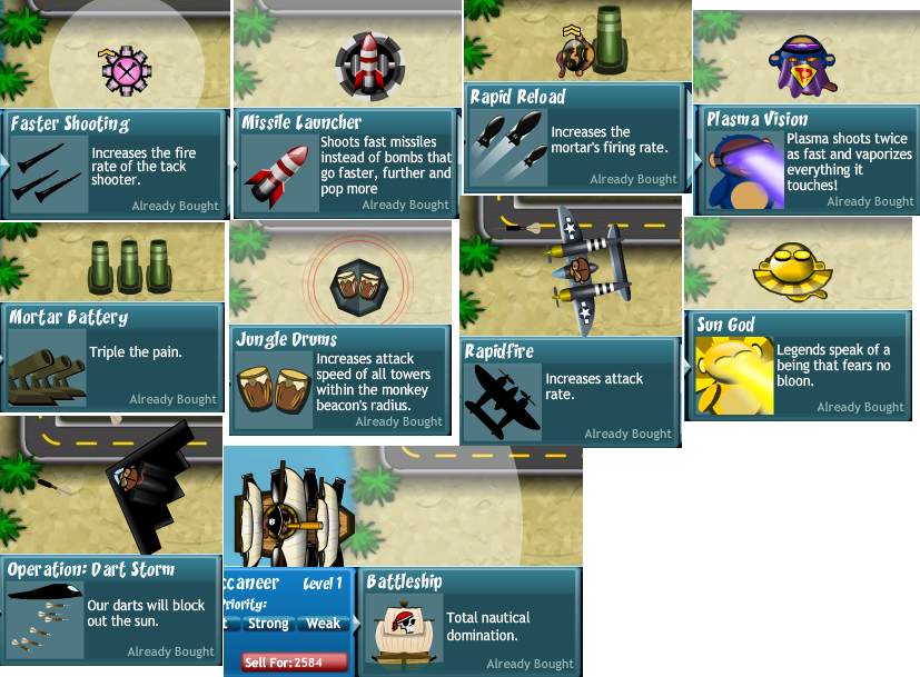 In addition to via upgrades and, the attack speed of towers can also be modified by equippable Weapons and Trinkets. Towers have a 60 attacks per second (0.0167s) limit on how fast they can attack, as the game runs at 60 FPS. In-game, a tower's attack speed can only be done in multiples of frames, as unlike BTD6 or BSM2, there is nothing that simulates attacks occuring between frames. Note that some attacks can reach 60 attacks per second in-game simply by going over 30 attacks per second. For instance, Supermonkey with all upgrades without activating Sun God cannot easily fire more than 20% faster after maxing out his upgrades in-game, as he already attacks every 0.04 seconds with the Hypersonic Speed upgrade, which by default is rounded to attack once every 3 frames, or 0.05s. If given enough attack speed, he can attack every 2 frames, the equivalent of every 0.0333s instead. Using Trail Mix and Party Time will easily let him attack 60 times per second, if he already attacks 30 times a second.