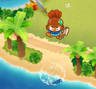 The barracuda regularly leaps out of the water to hit bloons, dealing 2 damage to up to 4 bloons and knocking affected bloons backwards in the process. It can hurl itself at bloons from slightly further.