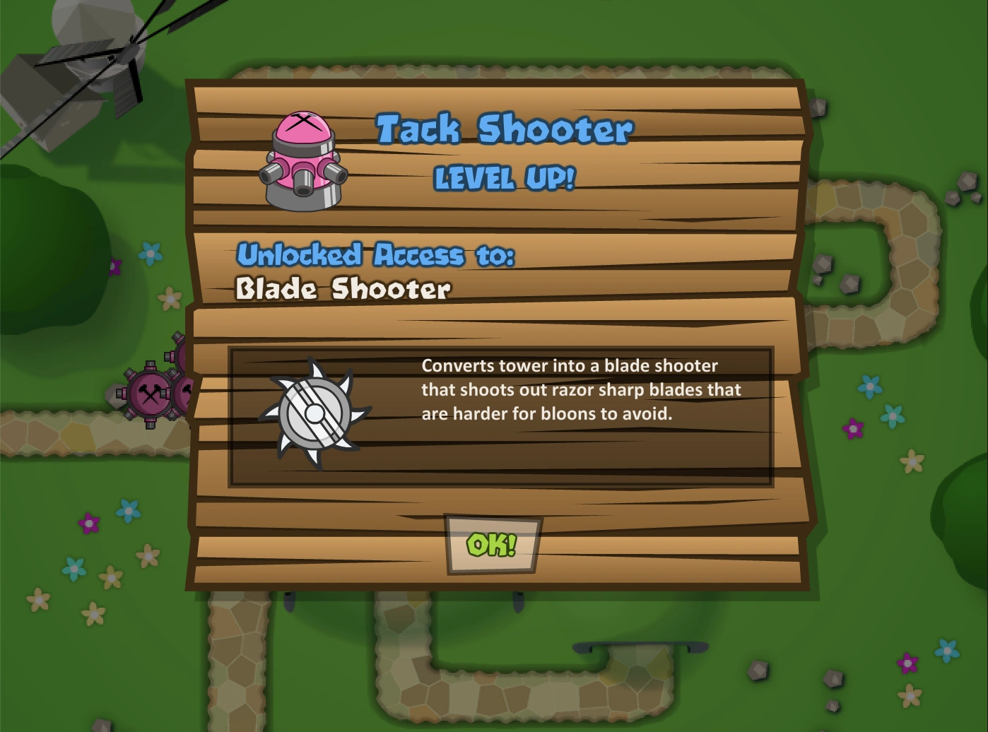 The Blade Shooter is the third upgrade of the Tack Shooter. Instead of the tower shooting tacks, it shoots larger razor blades with more accuracy. This upgrade will also pop more bloons and shoot faster.