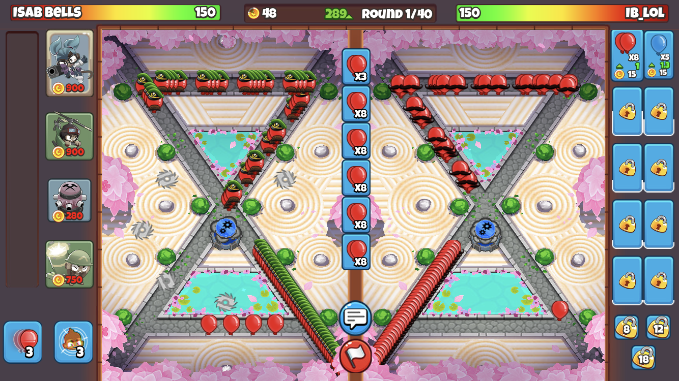 It is a powerful choice for dishing out lots of grouped damage. Find a spot where as many blades can reach the bloons as possible, and it will defend reliably against almost all types of early-round sends up till massive Grouped Yellows. With proper positioning, a 2-3-0 becomes essentially unstoppable against Spaced Whites and Spaced Blacks. Blade Shooter, while it excels in the early-game, becomes less of a bloon-popping carrier leading into the mid-game, but remains a good option for chipping away at bloons including Purples.