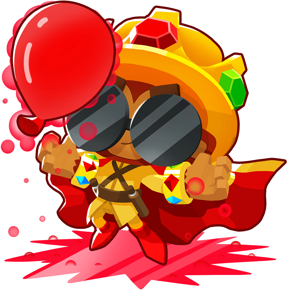 Bloon Master Alchemist takes on a flashy golden outfit. It wears big glasses with a red cape similar to the Super Range Super Monkey.
