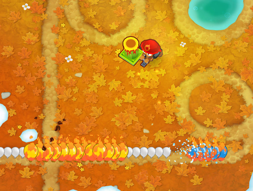 Burny Stuff also improves its napalm damage-over-time with Path 2 crosspathing. Starting from 0-3-2, napalm deals 4 damage per tick with Heavy Shells, 6 with Artillery Battery, and finally 20 damage with a 7.5s duration at Pop and Awe. The Pop and Awe ability also continuously applies napalm that deals 36 damage per tick with a 7.5s duration (refreshing on each hit from the ability, for a maximum duration of ~15.5s).