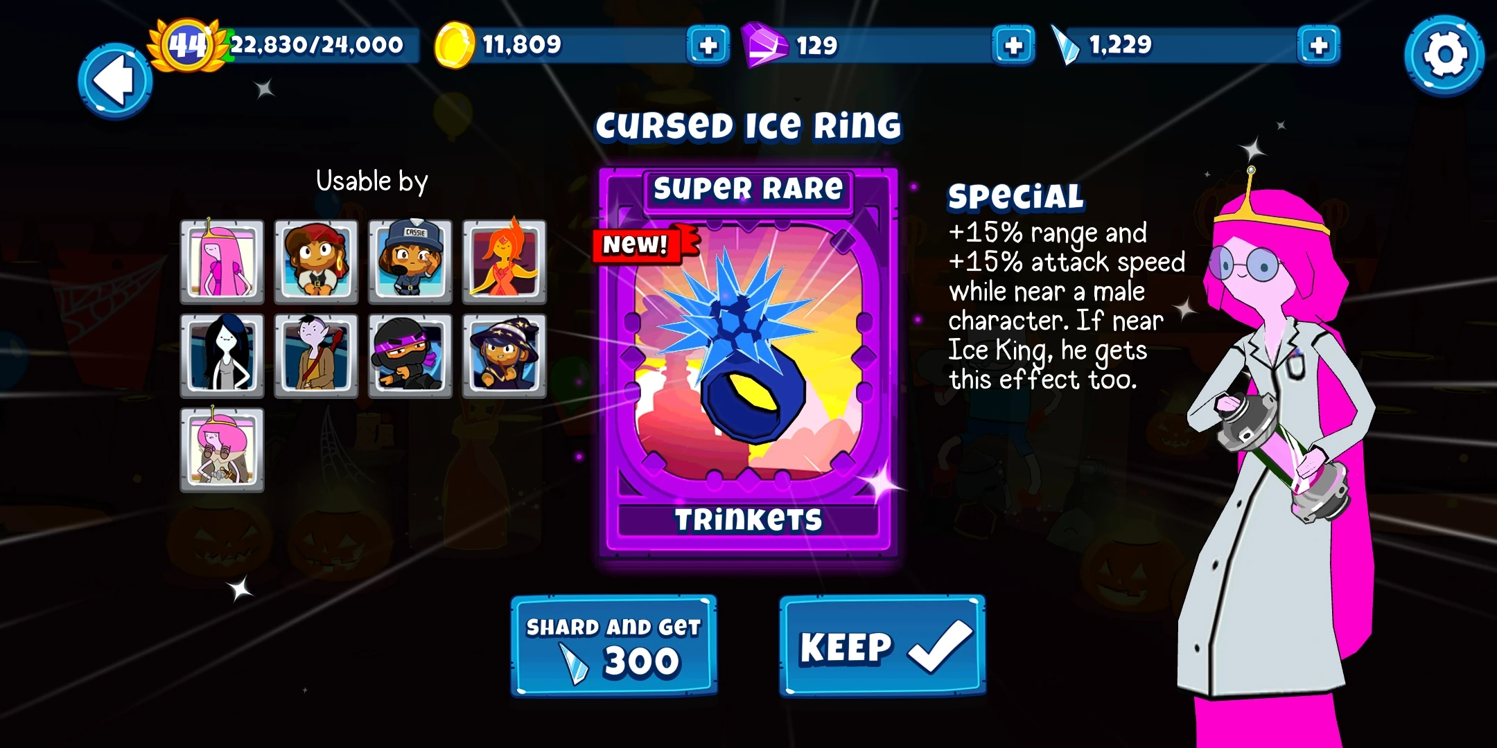 The Cursed Ice Ring is a Super Rare Trinket in Bloons Adventure Time TD. It can only be equipped by female characters (Captain Cassie, Commander Cassie, Princess Bubblegum, Warrior Bubblegum, Marceline, Hunter Marceline, Flame Princess, Sam and Sai).