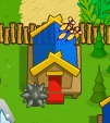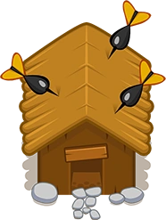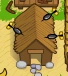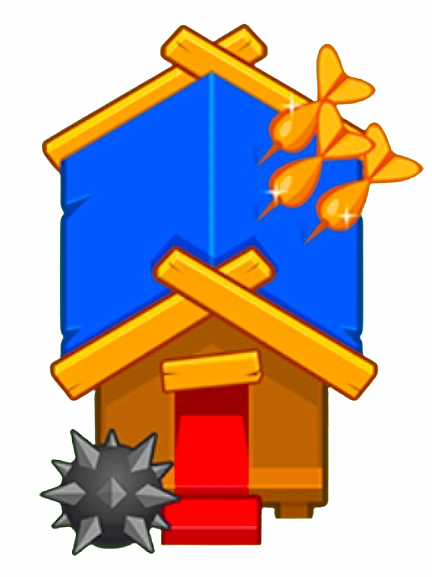 The Dart Monkey Hall looks like a wooden house with a straw roof. Three darts can be seen on the roof, possibly representing the Dart Monkey.