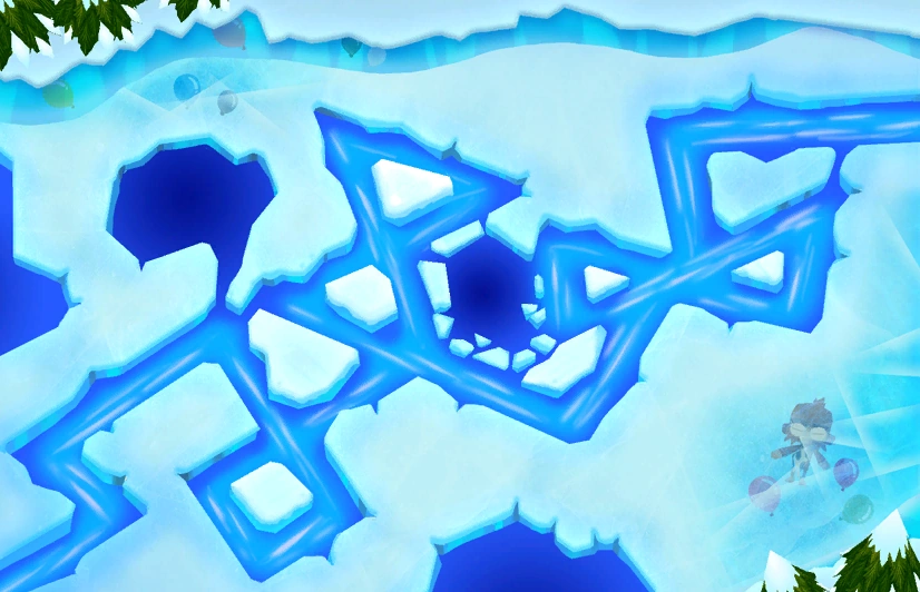 - One of the larger ice flows between the square and two triangles of the bloon track serves as an excellent vantage point, as towers like Super Monkey or Heroes like Captain Churchill have great range to cover a long portion of the track due to its tightly packed nature.