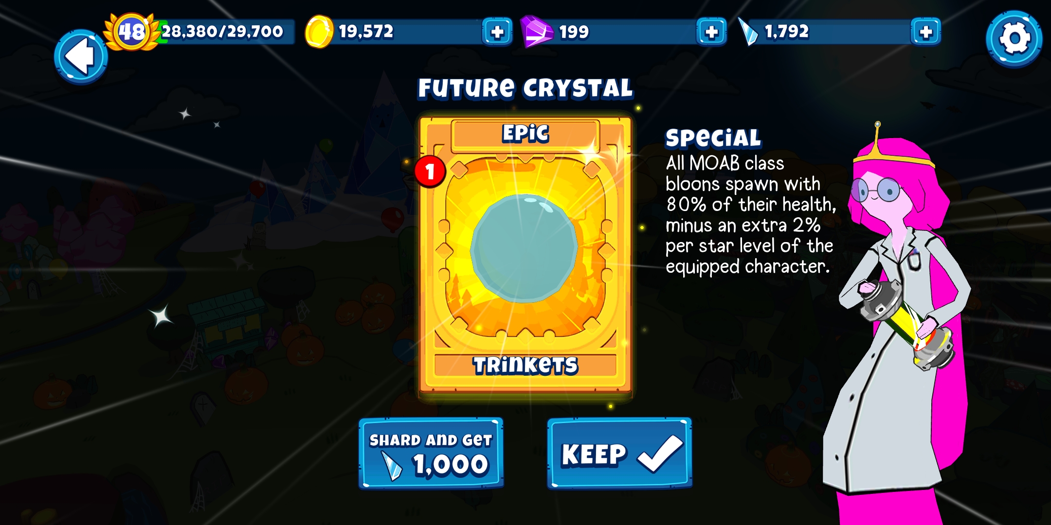 The Future Crystal is an Epic Trinket in Bloons Adventure Time TD. It has no character restrictions, letting any character equip it.