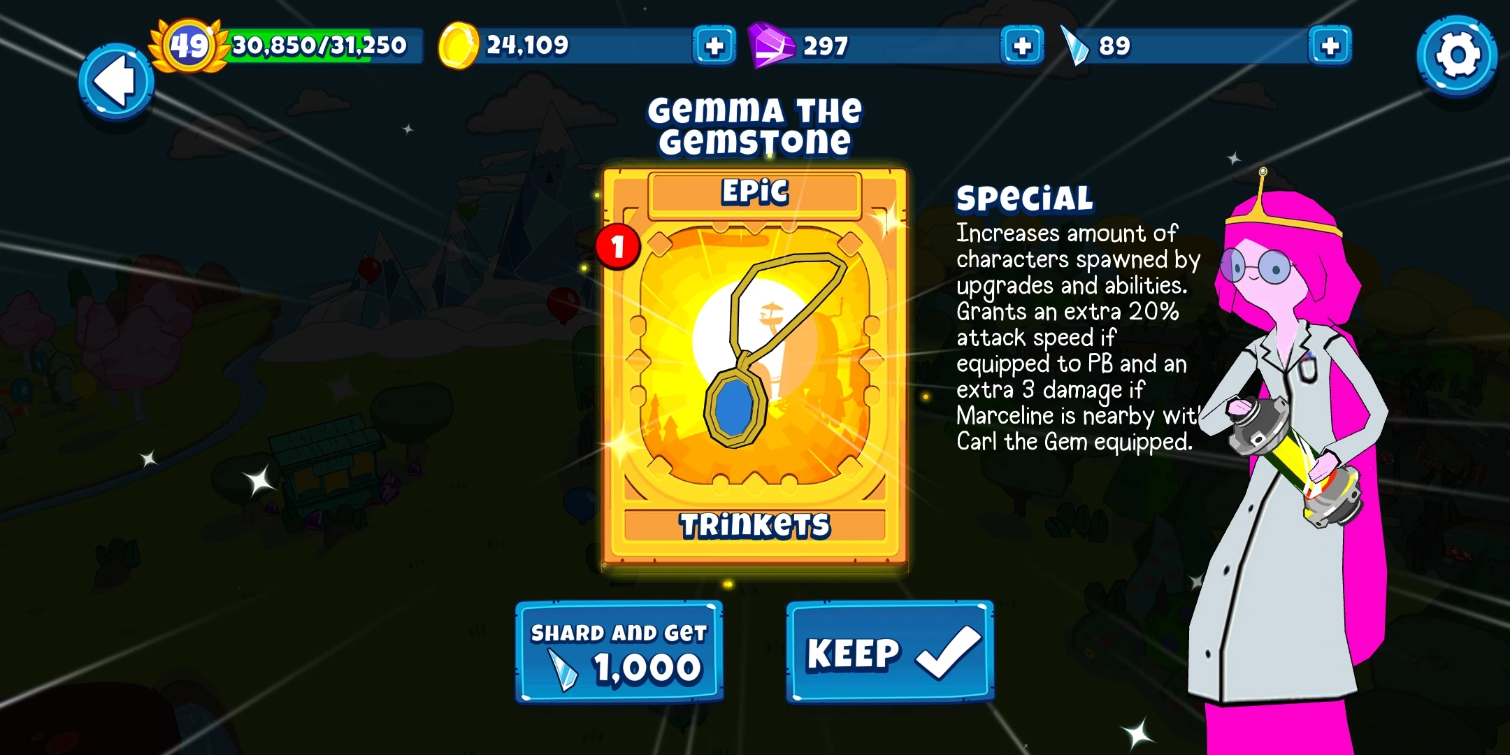 Gemma the Gemstone is an Epic Trinket in Bloons Adventure Time TD. When equipped to a character, it allows more sub-towers of that character to be summoned(at once? faster summons?). It has no character restrictions, letting any character equip it.