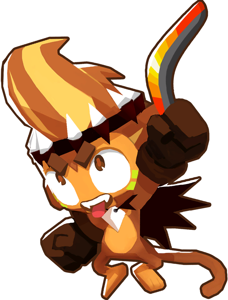 This upgrade replaces its hat with a large mohawk and a circlet made of teeth. They have added face paint. The monkey also removes their clothes and wears an Aboriginal cape. Crosspathing with Glaives adds a set of curved blades to the end of the kylies.