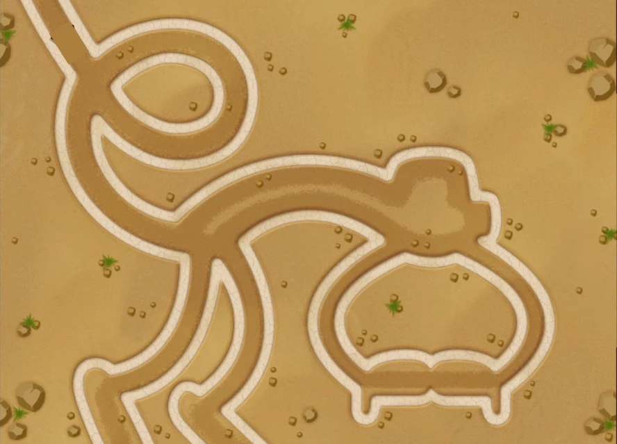 It consists of 2 close-together lanes in the shape of a Nazca geoglyph. The Bloons go travel from the feet, into the arms, then exit at the end of the tail. Towers can be placed anywhere in the light sand, except the body of the geoglyph monkey.