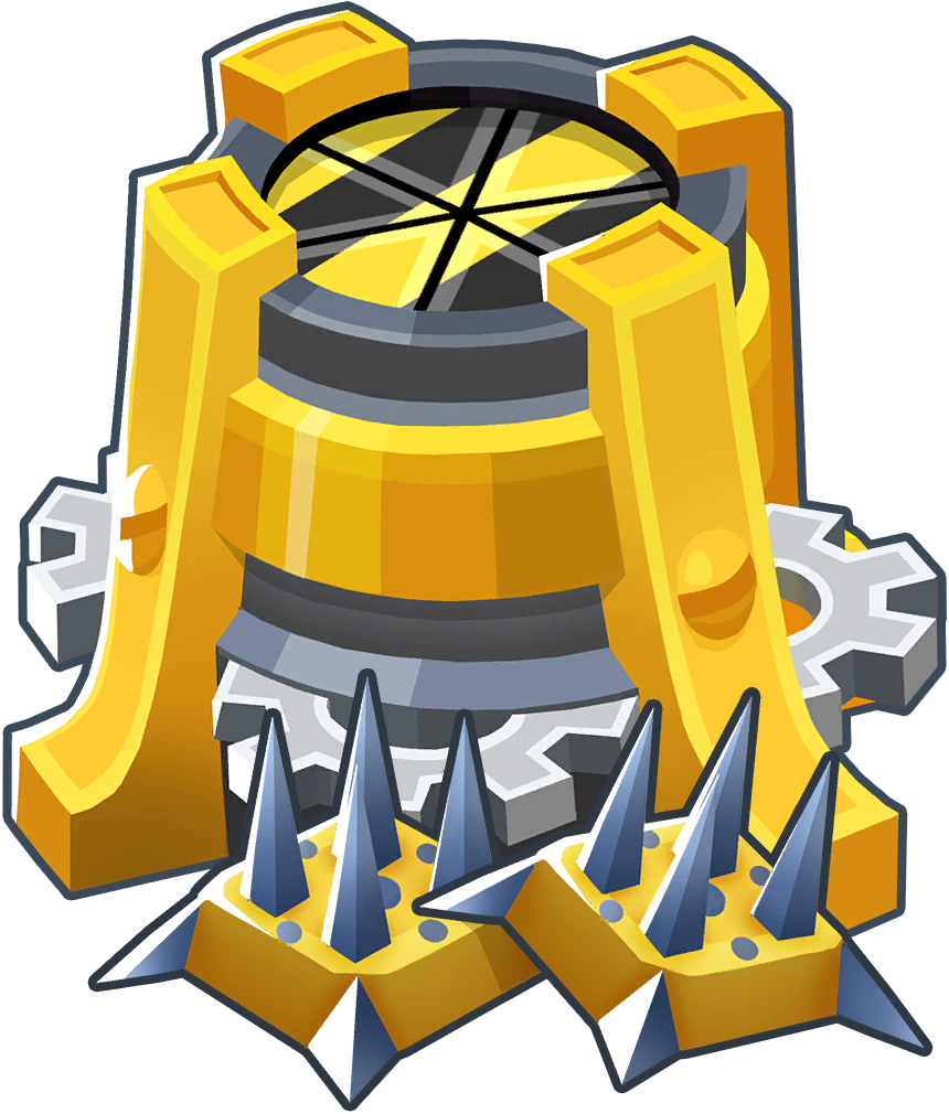 Perma-Spike is a much larger tower than its predecessor, with a primarily yellow color scheme, particularly for its four supports and connecting ring surrounding a grey main body; it also retains the four gears of Deadly Spikes.