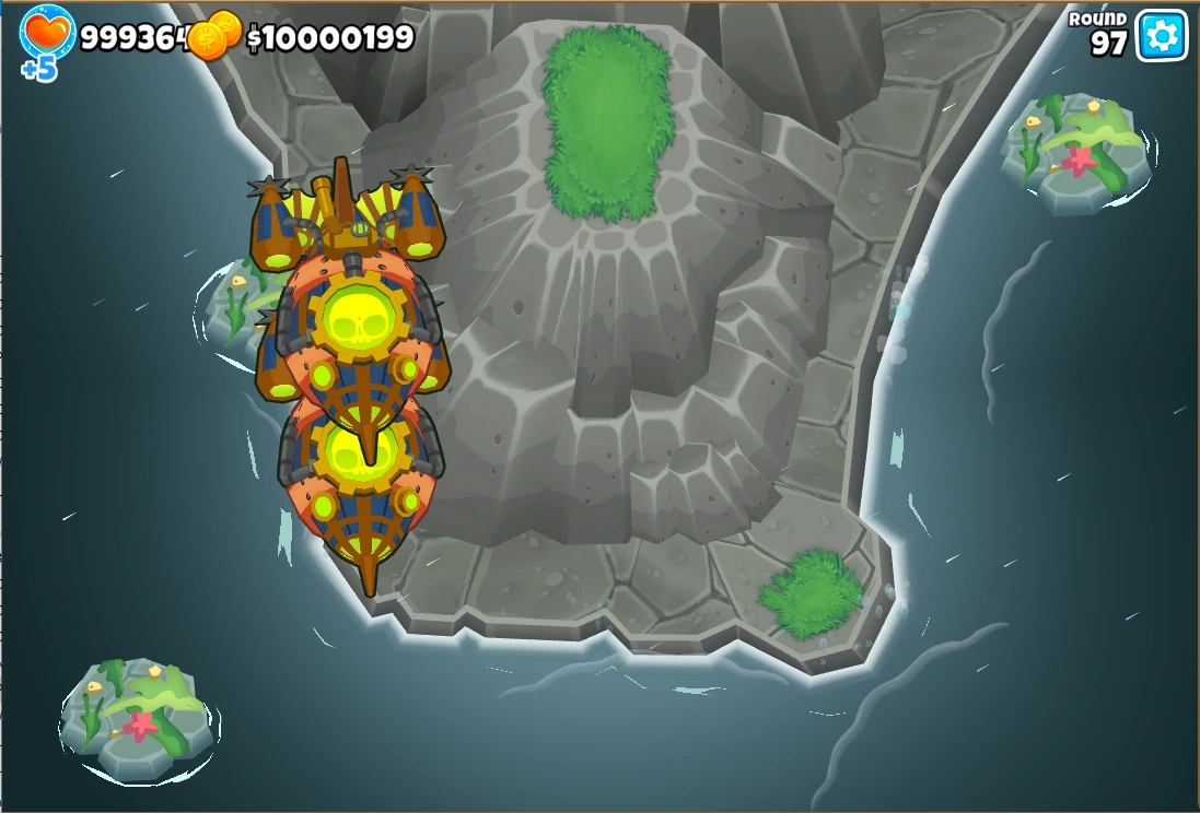 Round 97 is usually the easiest of the last 10 rounds of Impoppable and CHIMPS, since the two ZOMGs come alone with no other blimps protecting them. However, on some short maps like #Ouch and Blons they can pose a threat, since your Monkeys might not have enough time to defeat them. Stalling for enough time to recharge any abilities necessary to beat Round 98 is also important.