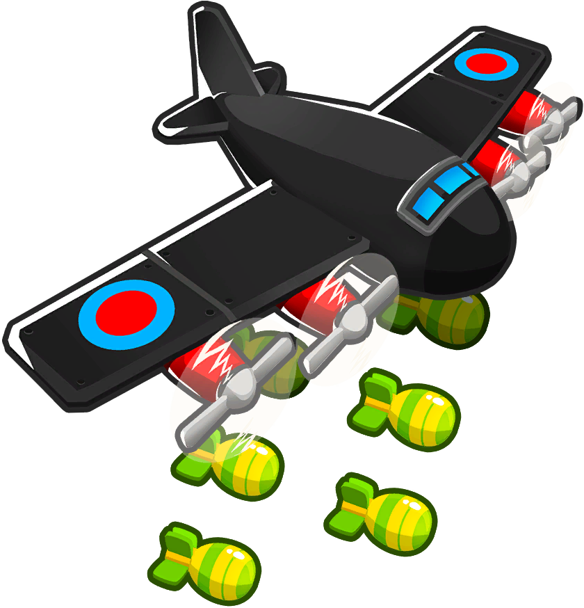 Spectre is a much larger plane than its predecessor, changing it from a biplane to a large black monoplane with four red engines, while retaining the signature red and blue roundels. Its artwork shows it dropping twin lines of bombs painted green with yellow stripes, similar to Mortar Monkey shells, however, in-game it actually fires the orange-striped darts of its previous upgrades and dark grey bombs bearing a red nose.