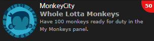 Whole Lotta Monkeys is an achievement that can be earned in Bloons Monkey City and Bloons Monkey City Mobile. It is earned by having 100 monkeys available to use in-game. Gaining the achievement rewards 50.